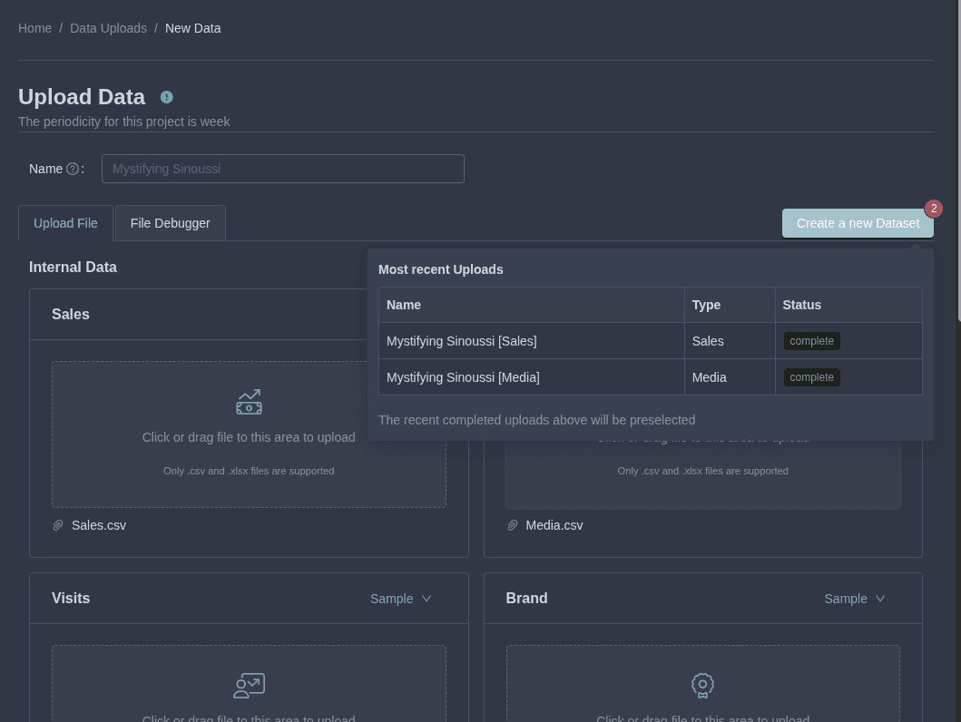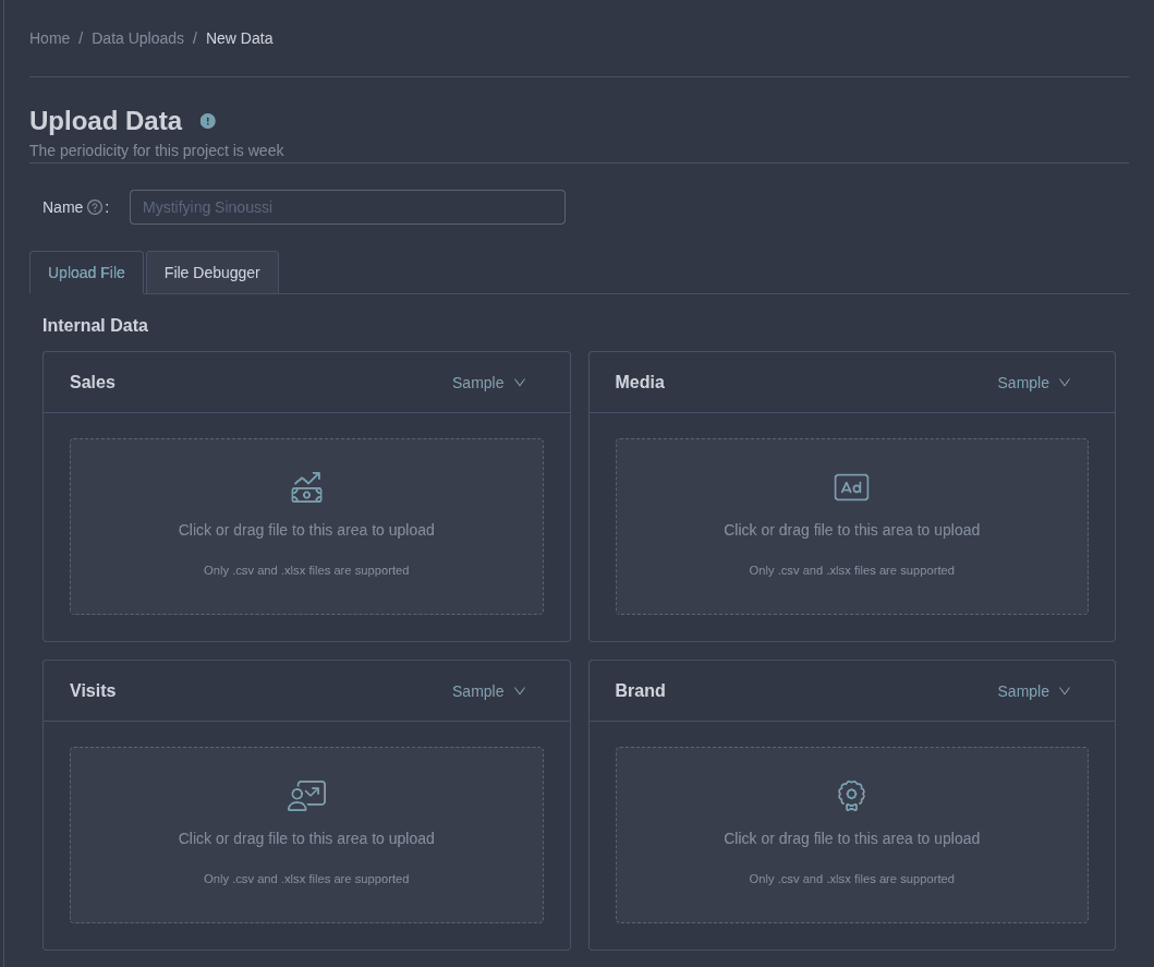 - Drag and drop or click to select files for each file type (e.g., Sales, Media).